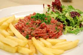 Filet américain — татарский бифштекс (сырой фарш) с каперсами, луком-шалот, вустерским соусом.