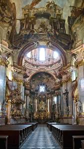 Внутри церковь богато украшена многочисленными фресками и скульптурами, созданными лучшими художниками того времени. 70-метровый купол украшен фреской «Святая Троица» работы Франца Палько. Это одна из самых больших фресок в Европе (1500 кв. м).
