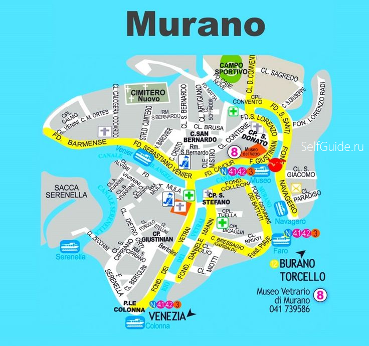 На острове есть 3 причала: возле музея стекла, у маяка и Piazzale Colonna. Здесь карта несколько устаревшая: теперь вместо маршрутов 41 и 42 у нас 4.1 и 4.2, которые идут к Венеции, а вместо маршрута 3 — номер 12 (он идет к Бурано и Торчелло).